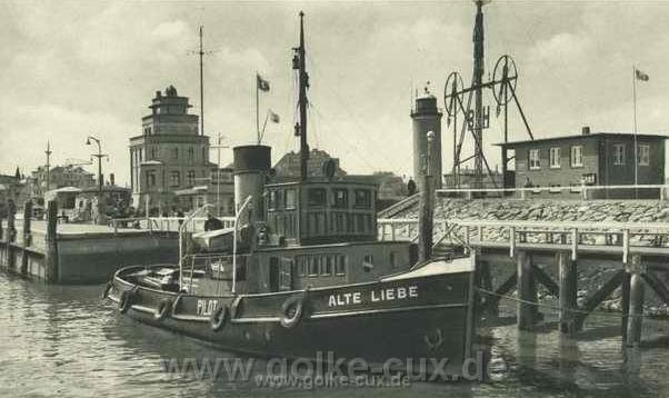 Der Lotsenversetzdampfer "Alte Liebe", im Hintergrund Signalstelle und Semaphor.